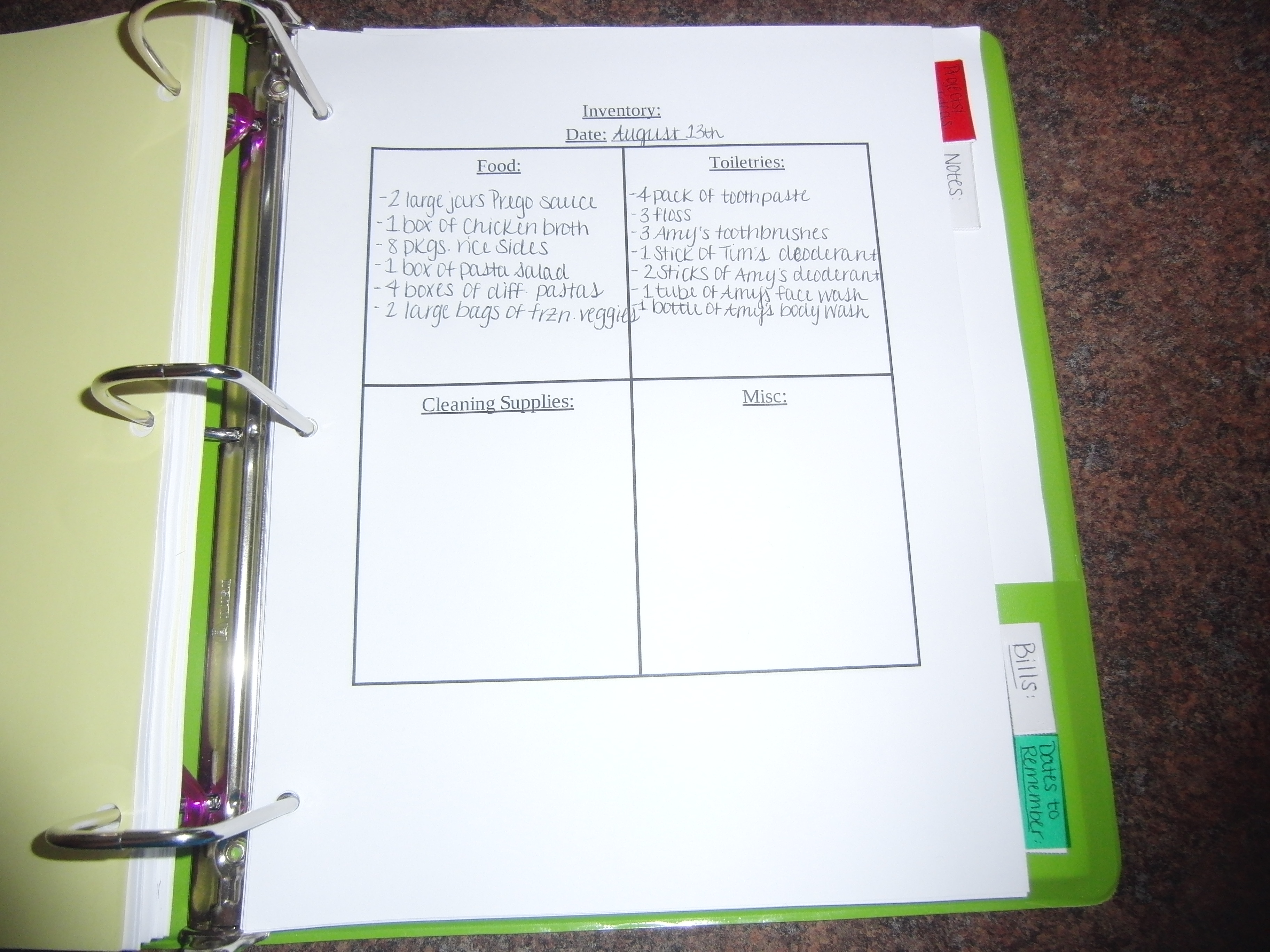 This worksheet is to keep track of what I have in my cupboards, cabinets, and closets. I like to bulk shop for toiletries, cleaning supplies, and some groceries at BJ’s. This helps keep track of what I have. It also helps to shape a weekly menu. I usually update every other week. I think once I go through the worksheets I printed out I might try a table outline. The four blocks don’t help me as much as I had hoped.